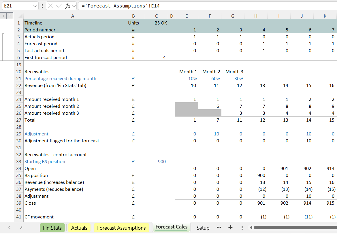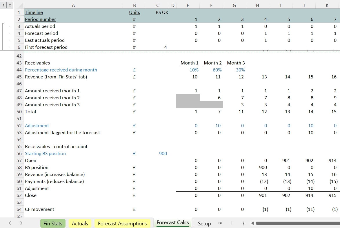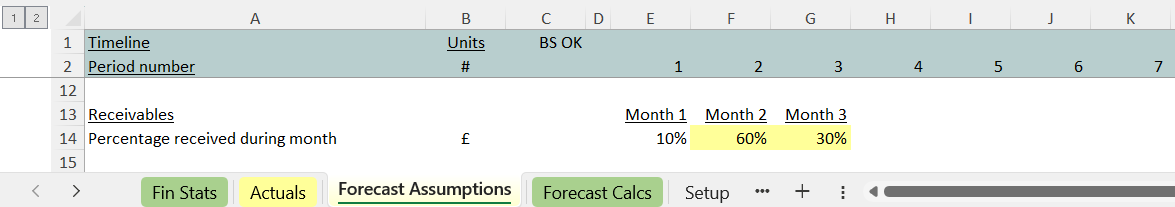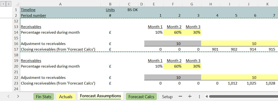 On the assumptions tab the receivables inputs are positioned after the preceding balance sheet inputs and before the inputs for the next line item.