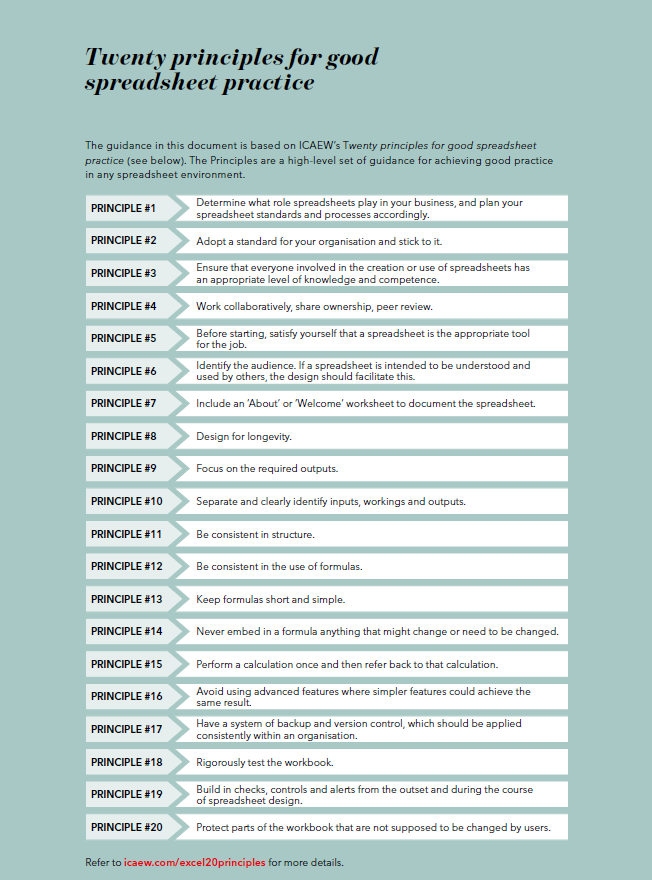 You can download a copy of the ICAEW’s Financial Modelling Code we subscribe to here: ICAEW Code.